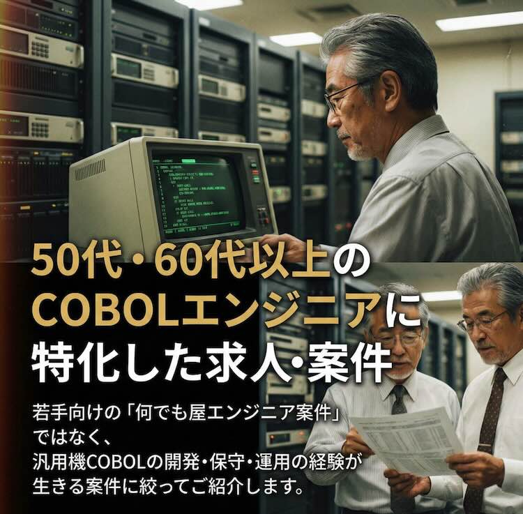 若手向けの「何でも屋エンジニア案件」ではなく、汎用機COBOLの開発・保守・運用の経験が生きる案件に絞ってご紹介します。